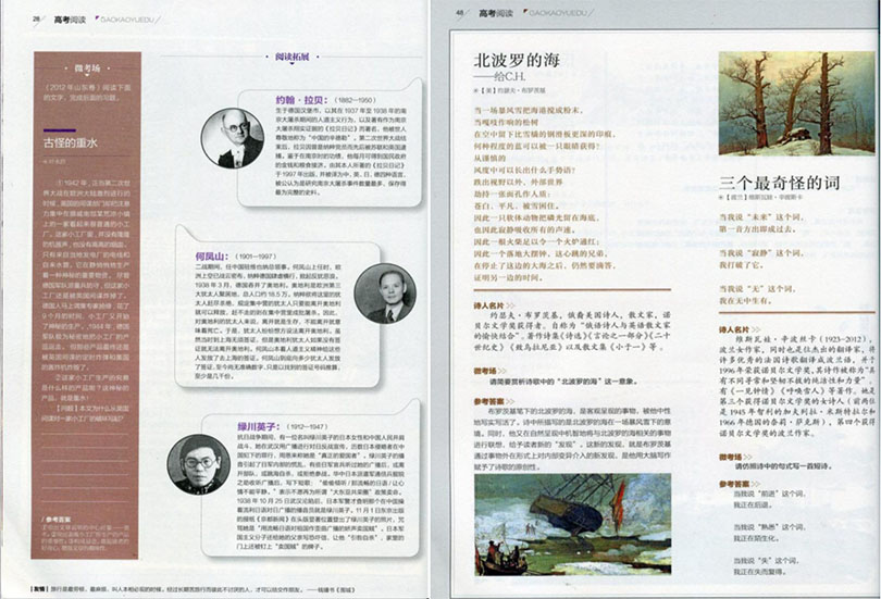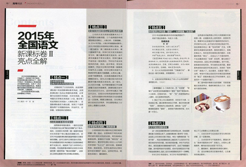 在《高考阅读》杂志的页面上,学生们可以接触到多种题材和不同难度的文章,如科学、文学、历史、哲学、社会等。这些文章选材广泛,贴近学生的生活实际和知识需求,能够培养学生的广泛阅读兴趣和深度思考能力。杂志注重文章的精细撰写,语言简练,逻辑严密,以帮助学生提高对文章的理解和分析能力。